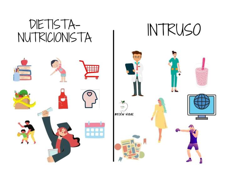 Aunque eso de nutrición personalizada suena muy bonito, a la población le gusta ir por la vía rápida y sencilla, como pueden ser esos batidos “milagrosos” que te hacen perder 10Kg en 2 semanas sin esfuerzo o los retos de pierde peso en 30 días de las revistas, pero… qué pasa con las patologías y los déficits nutricionales, qué ocurre con la adherencia al tratamiento, la educación nutricional y el cambio saludable de hábitos, qué hacemos con el estado de ánimo y la ansiedad, qué pasa con el <<<me han dicho que coma fruta pero no me gusta>, con la saciedad y el hambre emocional. Un intruso laboral no se va a preocupar de todo esto porque no es consciente de todo lo que implica la nutrición y la dietética, y es que es mucho más que comer, y esa falta de conocimiento sólo puede ser perjudicial.